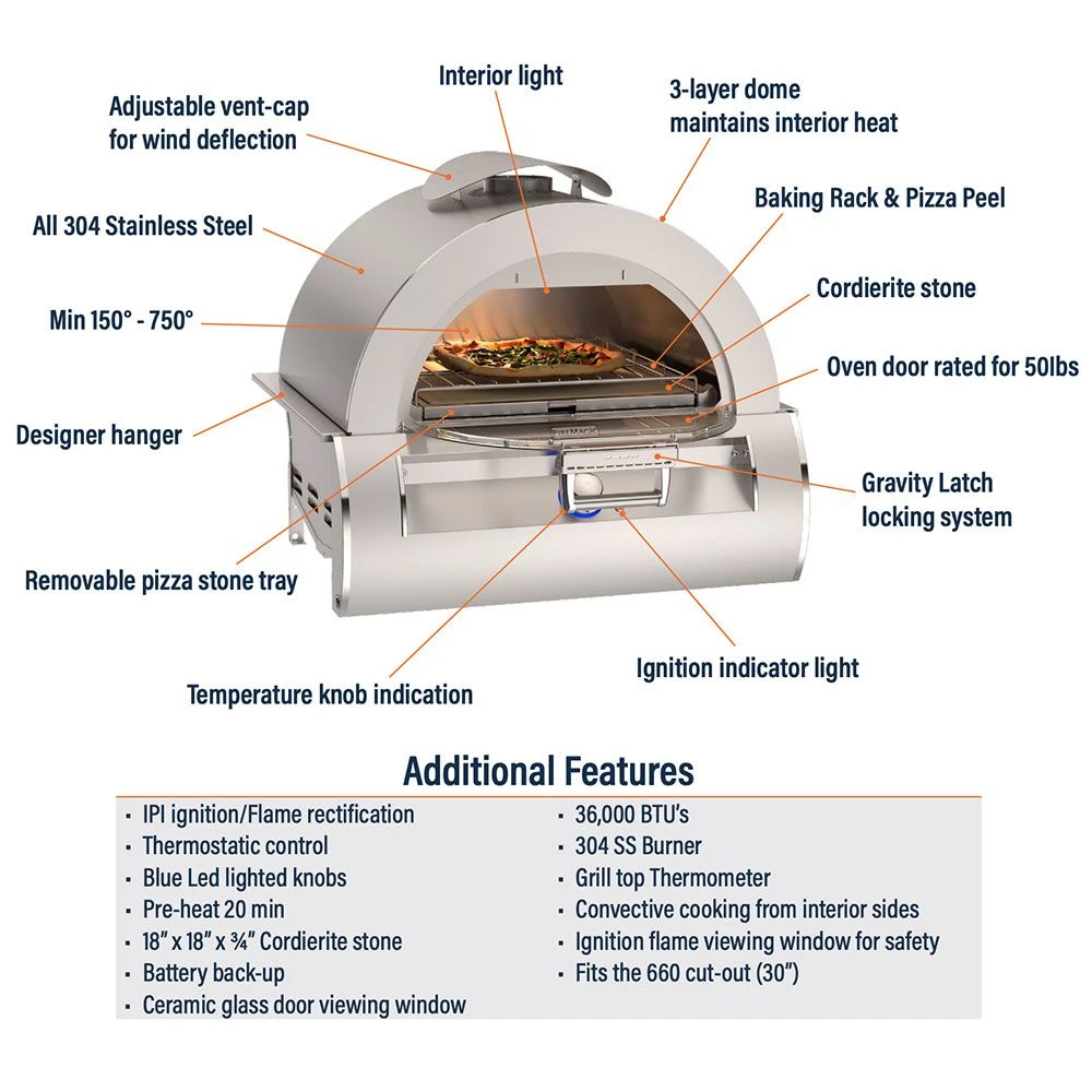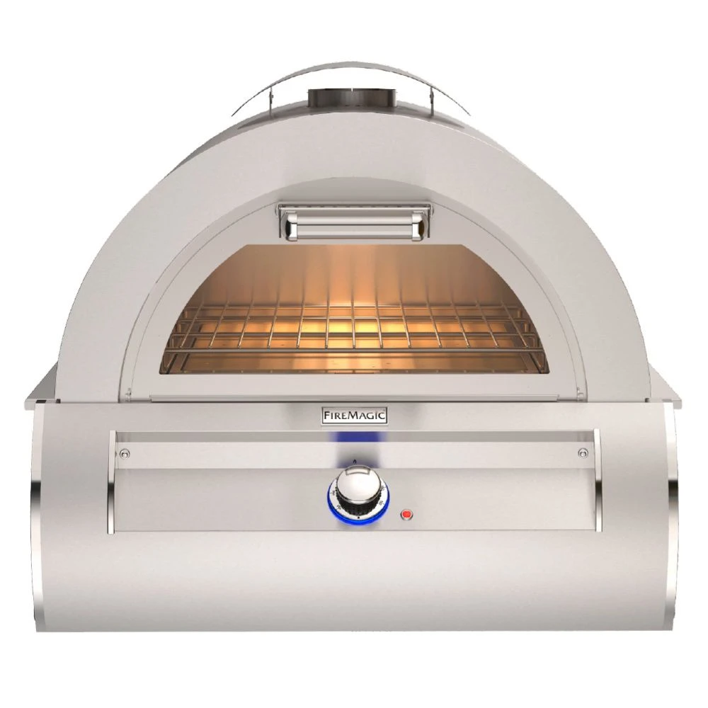 Fire Magic Stainless Steel Built-In Gas Pizza Oven, 30-Inch provides a high quality upgrade for your outdoor kitchen, combining durable, corrosion resistant construction with a high-power 36k BTU stainless steel burner for a total performance package. It features a three layer dome and ceramic glass door viewing window to keep heat inside the cooking chamber where it belongs. Smart features like an LED control knob, gravity latch lock and interior lighting for convenience and ease of use. This oven is equipped with a baking rack, pizza peel and Cordierite stone to provide flexible options for making pizza, bread and desserts with ease. You’ll be getting more mileage out of your outdoor kitchen with this gas pizza oven by Fire Magic.