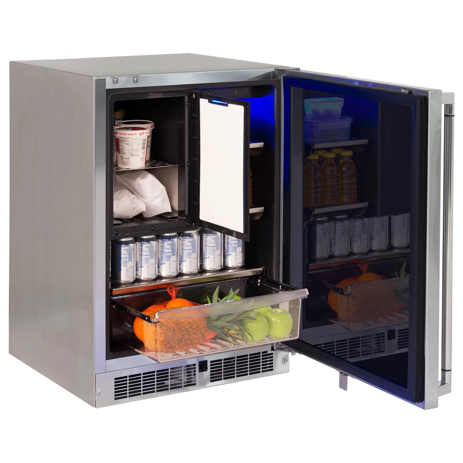 Lynx LN24REFC Stainless Steel Outdoor Refrigerator with Freezer Combo, 24-Inch provides a high quality outdoor kitchen refrigeration option to complete your ultimate outdoor BBQ paradise. This unit is built from 16-gauge 304 stainless steel with smooth welded joints for a blend of style and durability that will stand up to the elements in any climate. This outdoor refrigerator is UL listed for outdoor use while the large capacity provides plenty of outdoor refrigeration space, featuring (4) tempered glass shelves with adjustable positions complete with striking LED lighting. The interior 1ft³ freezer features a self-closing door and is large enough to hold up to 12 pints of ice cream while an automatic defrost feature provides frost-free operation – plus an optional ice maker kit is available to produce and store up to 13 pounds of ice. The adjustable temperature control offers customizable cooling while the leveling legs and GFI equipped plug make this unit perfect for built-in or freestanding applications. The entire line of Lynx Professional outdoor kitchen equipment features the same polished stainless construction for a matching stylized look to transport your kitchen outdoors.